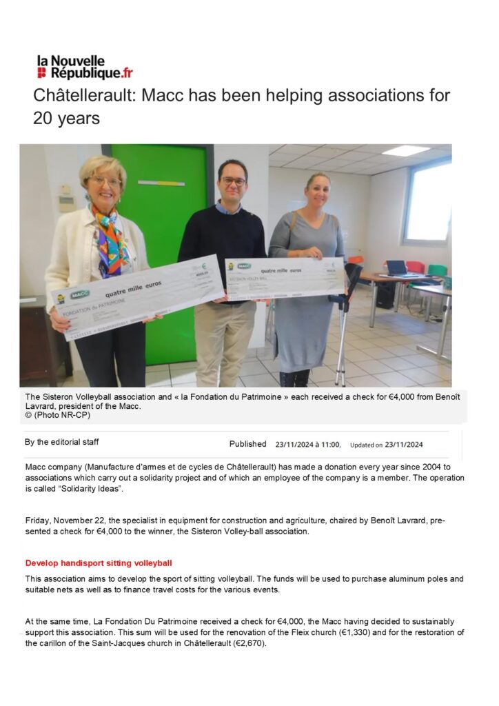 Since 2024, 32 associations supported by MACC: “AUTISME VIENNE, ECLAIR, Enfants du Rio, L’OUTIL EN MAINS chauvigny (86) and ALBI (81), Les Virades de l’Espoir, FFK Vienne, Demain Antoigné, Social Center and Cultural of the Plaine d’Ozon, Santé sans frontière, APEVO, Cavallino Rosso Club France, AMLO, House of the bee and the nature, MIRA Europe, Avec Arthur, API, Handi soins, Aptesian Volleyball Club, Un geste pour un sourire, Un Roman d’amour, Taekwondo Valvert, Eulavie, Cie des archers de l’Envigné, Ferme de l’Espoir, Renaissance Africa, Haute Garonne Basketball, Partage avec les enfants du monde, CS Dissay, Phoenixdarts, Captain’Nemo, Sisteron Volleyball”